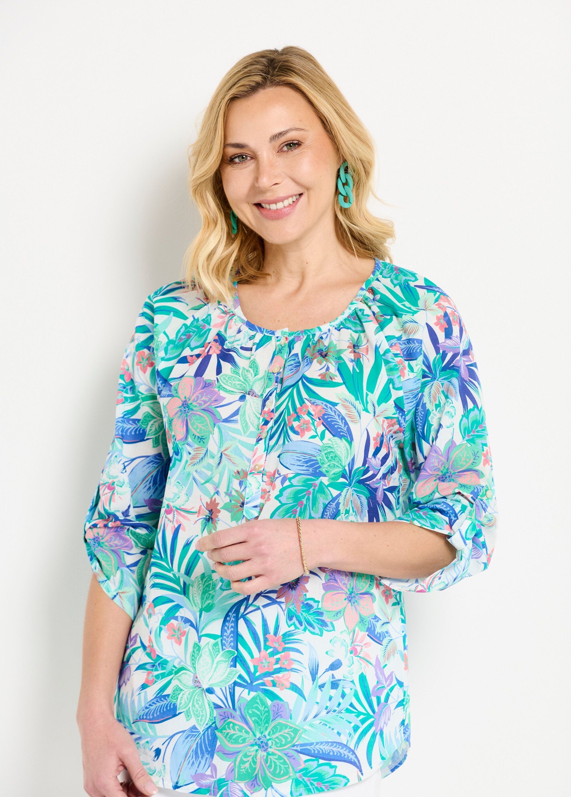 Long_tunic_with_floral_voile_and_ruffled_V-neck_Blue_and_green_FA1_slim Long_tunic_with_floral_voile_and_ruffled_V-neck_Blue_and_green_DO1_slim