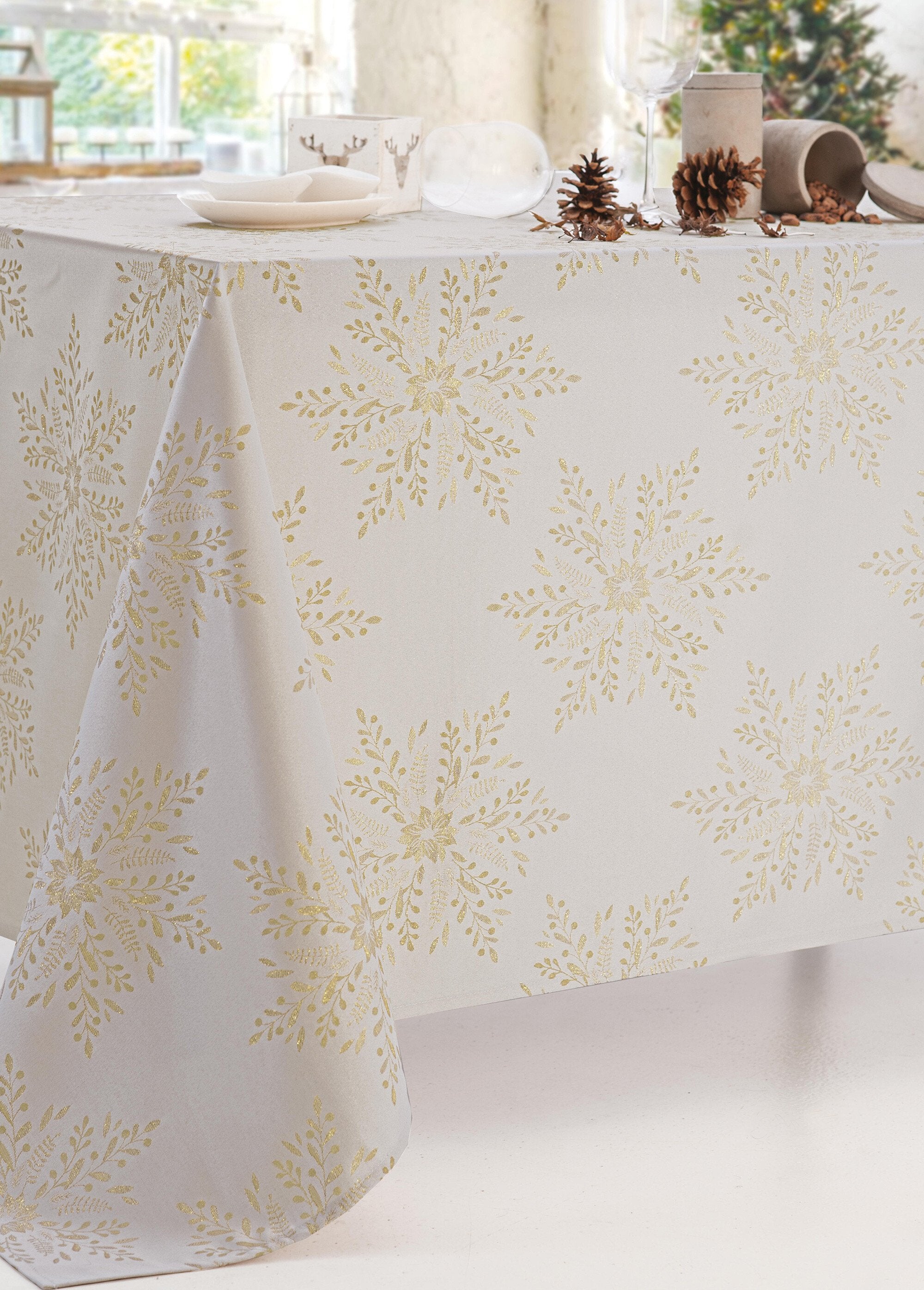 This festive tablecloth stands out with its pattern of large stylized golden snowflakes on a pristine white background, bringing a wintery and refined atmosphere to your table. The golden snowflakes add a festive and bright touch, perfect for creating a warm and elegant atmosphere during end-of-year celebrations. Ideal for dinners with family or friends, this tablecloth transforms your table into an enchanting setting, inviting you to share beautiful moments around a carefully decorated table.