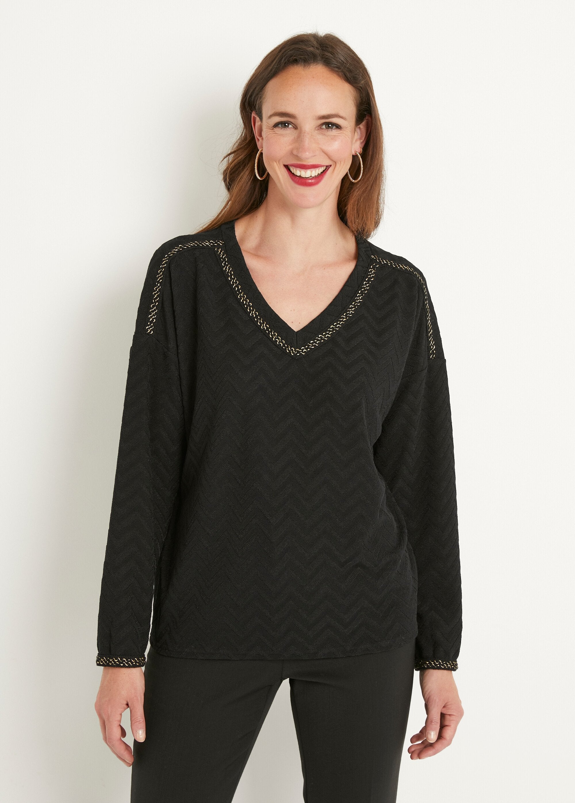 Graphic fantasy on warm knit, well-placed iridescent braids and fashionable volume. Between sweatshirt and sweater, the women's T-shirt will easily find its place in the winter wardrobe. A piece to wear without limits: on floral pants, on black jeans, with a long bohemian skirt... It's up to you to exploit its style potential!